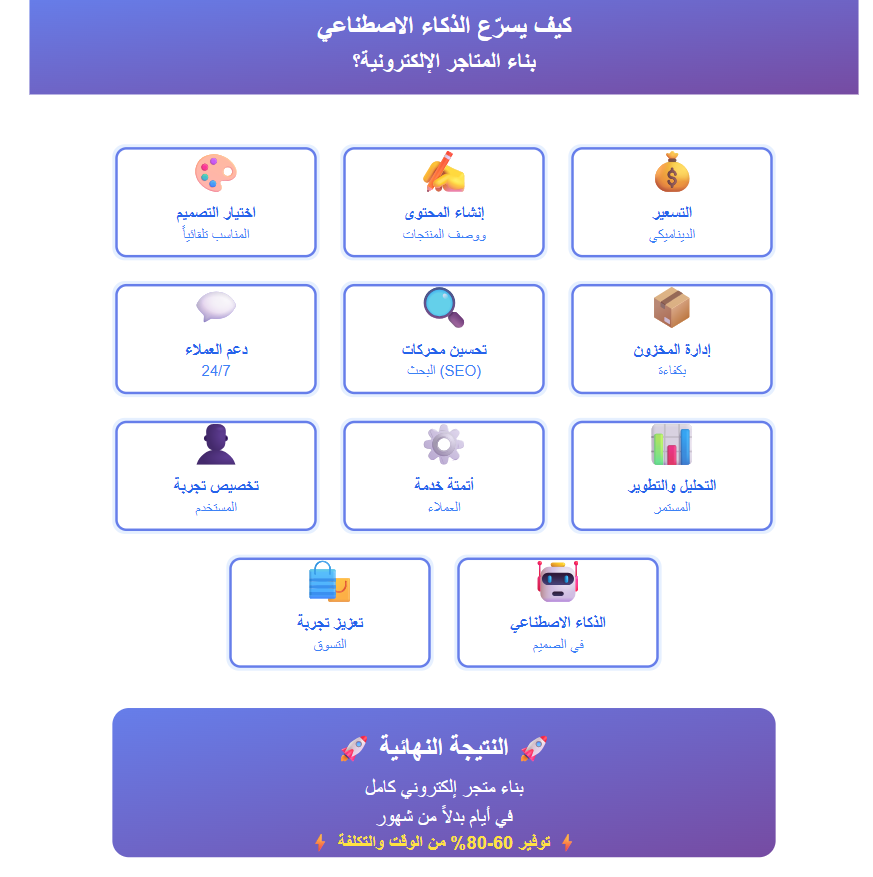 باختصار تجمع أدوات الذكاء الاصطناعي بين الكفاءة، التوفير، والتخصيص الذكي، لتمنحك كل ما تحتاجه لبناء متجر الكتروني احترافي خلال 24 ساعة فقط.