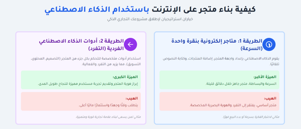 كلا الخيارين صالحان ويعتمد الاختيار على أهدافك، مواردك، ورغبتك في التخصيص. سواء اخترت السرعة أم التفرد، فإن الذكاء الاصطناعي يوفر لك الأدوات اللازمة لتنافس بثقة في عالم التجارة الرقمية الحديثة.