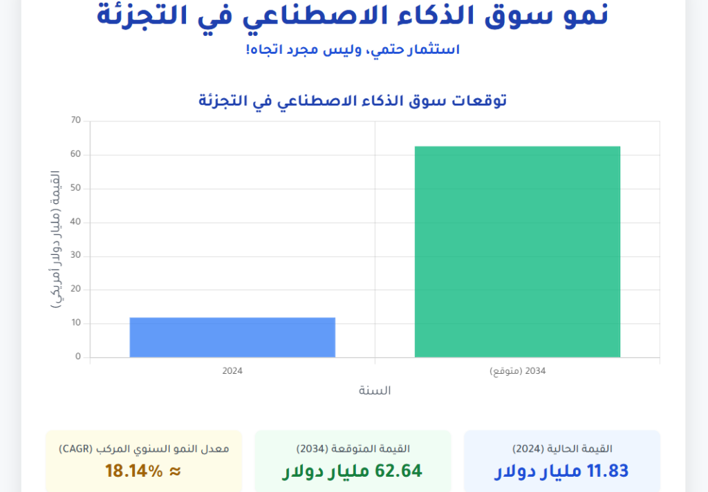 وبحلول عام 2026، يتوقع أن يصل حجم سوق التجارة الإلكترونية العالمي إلى 32 تريليون دولار (Statista)، وسيكون الذكاء الاصطناعي في قلب هذا النمو يقود إنشاء المتاجر الذكية، ويمنحها المرونة والقدرة على التوسع.