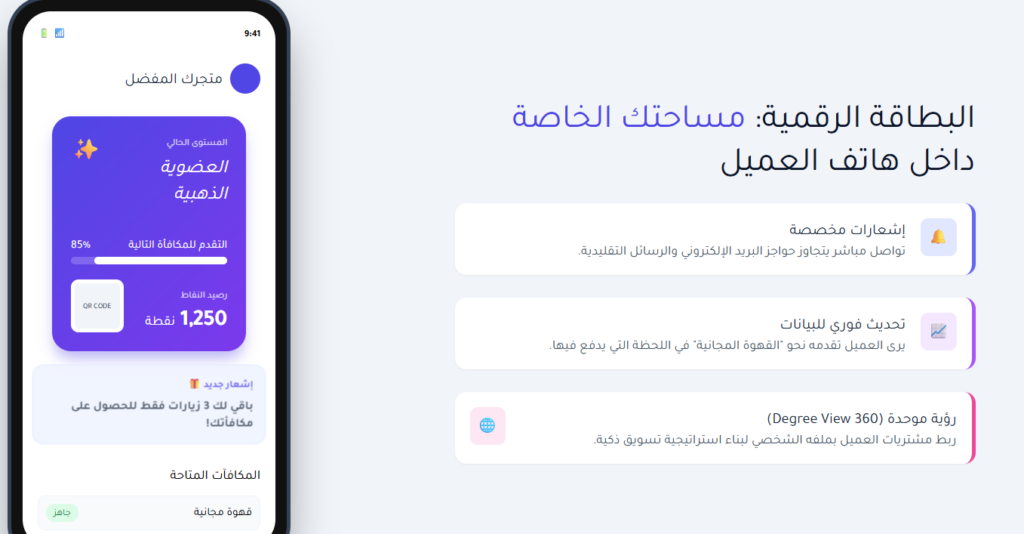 بطاقة الولاء الرقمية الحديثة ليست صورة ثابتة أو رمز QR فقط، بل هي أداة تفاعلية ديناميكية تحدّث في الوقت الفعلي، وتعرض: رصيد النقاط، مستوى العضوية، المكافآت المتاحة التقدم نحو المكافأة التالية.