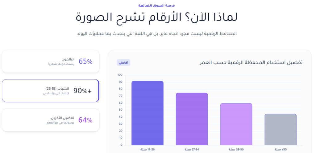 - لدى فئة الشباب، التحول أكثر وضوحًا؛ إذ يعتمد أكثر من 90٪ من المستهلكين بين 18 و26 عاما على المحافظ الرقمية كوسيلة أساسية للدفع وحفظ البطاقات.