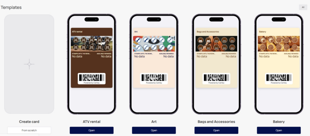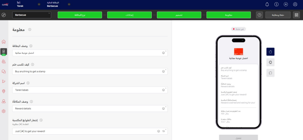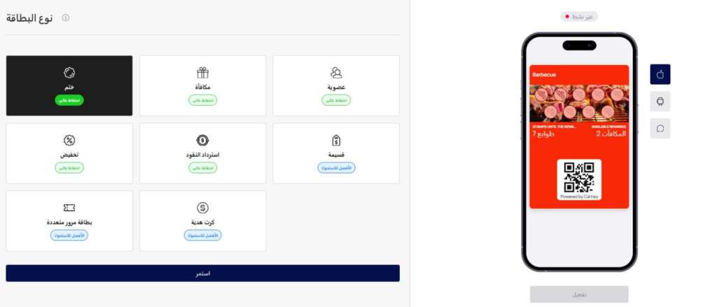 تبدأ الرحلة باختيار قالب بطاقة ولاء مخصص يعكس هوية علامتك التجارية، مع إمكانية التعديل لاحقا دون الحاجة لإعادة البناء من الصفر
