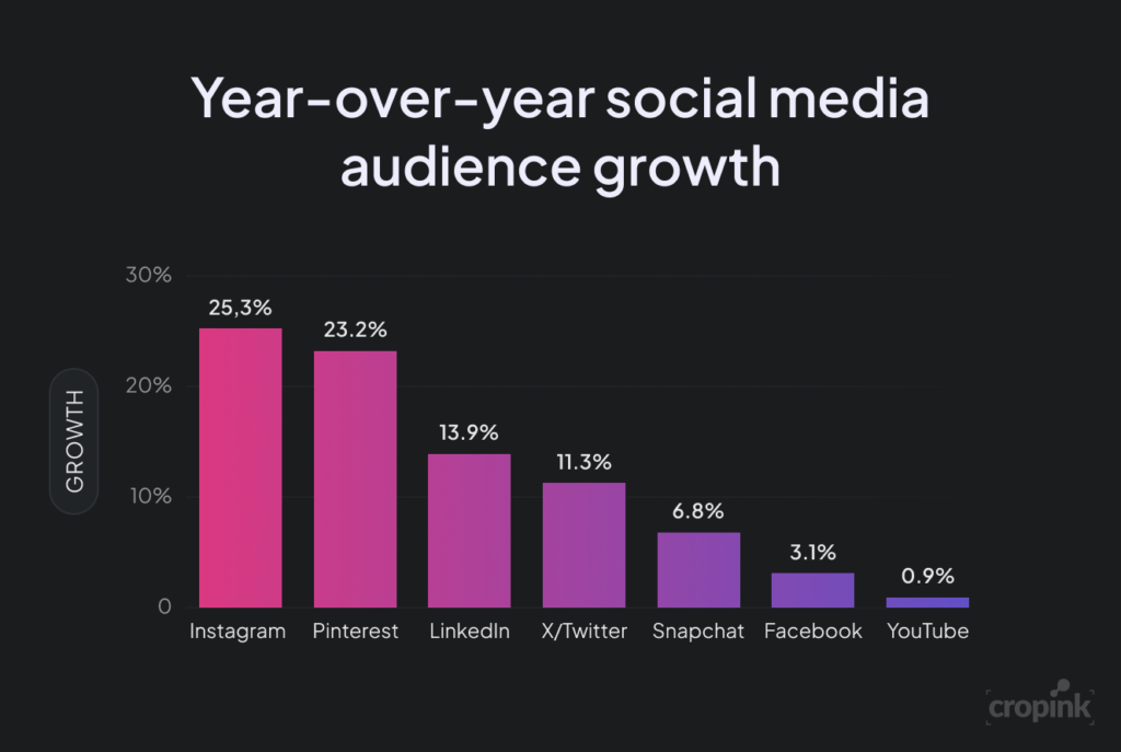 ويظهر الرسم البياني التالي معدل نمو الجمهور على منصات التواصل الاجتماعي مقارنة بالعام السابق، حيث يتصدر إنستغرام المشهد بمعدل نمو مذهل يبلغ 25.3%، متفوقا على Pinterest 23.2% وLinkedIn 13.9%.