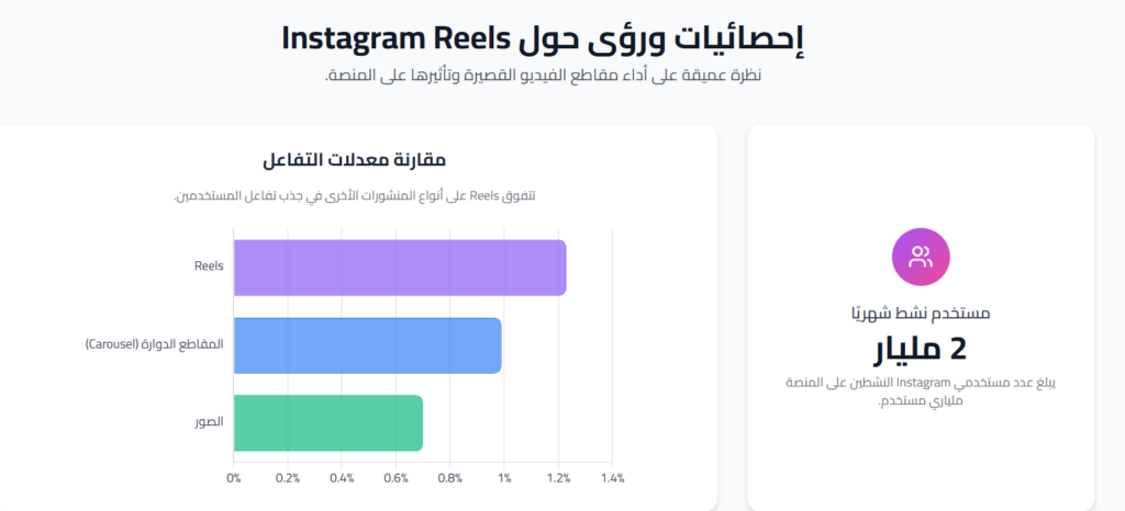 Reels على معدل تفاعل يبلغ 1.23% مقارنة بـ 0.70% للصور و0.99% للكاروسيل (Vidico).